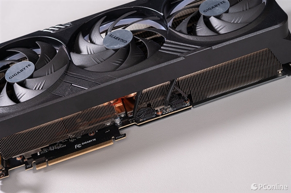 再从侧面望去,不得不说高端显卡的厚度也是相当惊人,已经接近4槽厚了。玩家在选择机箱时一定要注意它的长度与厚度才行。