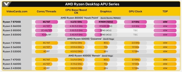 虽然名为锐龙8000G系列,但实际上可以看做是桌面版本的锐龙7040系列移动处理器,采用了Zen4的CPU架构和RDNA3架构核显,TDP均为65W。