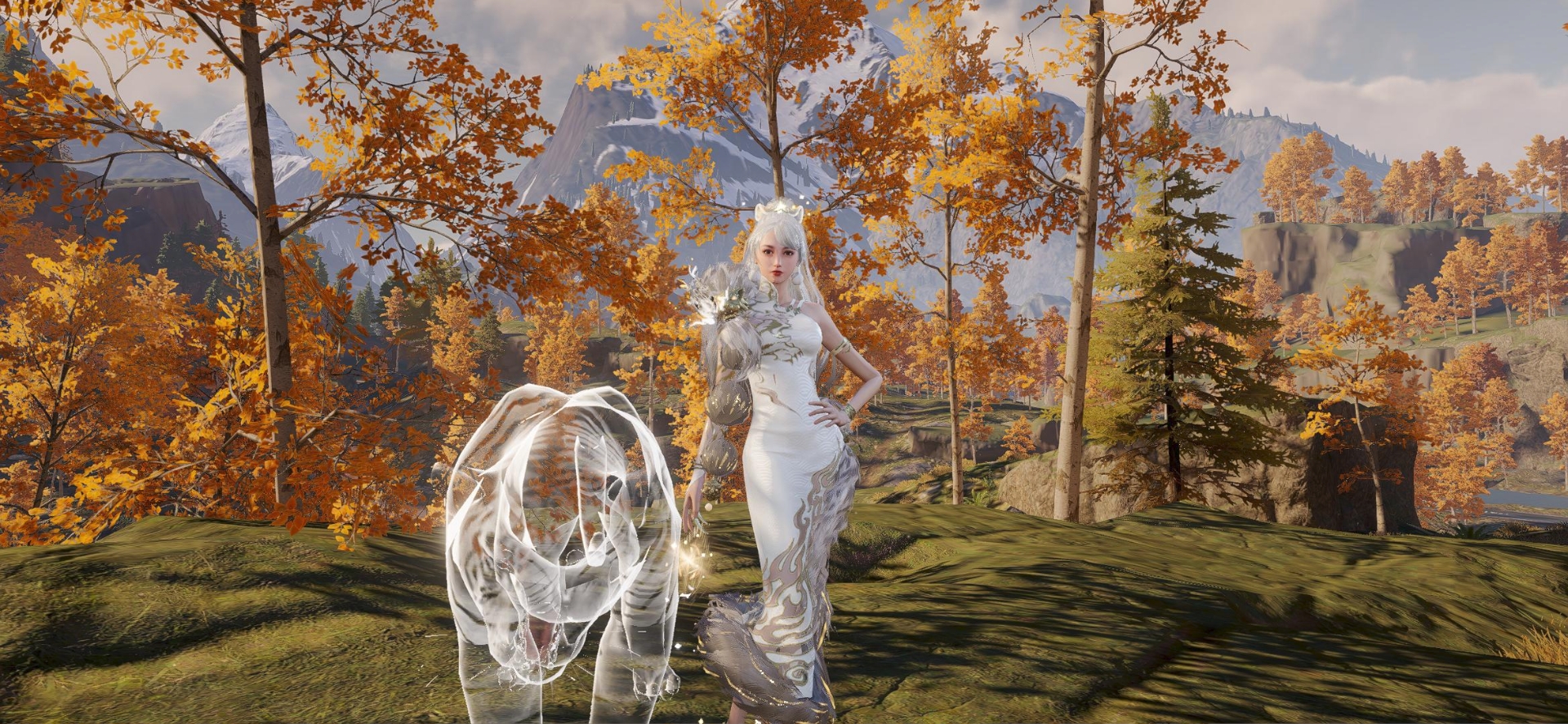 右臂上则印有仿白虎皮纹的金色纹路,彰显野性与力量。肩部搭配柔软的毛毛披肩,并点缀一枚精致虎头装饰,整体更显层次感。扎起的高马尾上配有俏皮的虎耳装饰,既干练又不失可爱。