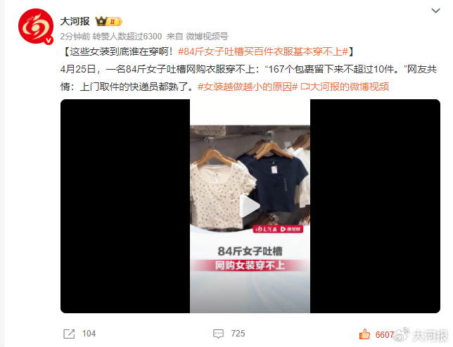 近日,@大河报报道#84斤女子吐槽买百件衣服基本穿不上#引发关注。当事女生表示自己体重84斤,但收货167个包裹绝大多数因为穿不上而退货。