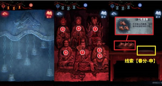 【聂莫琪视角】然后根据之前在聂莫黎视角获得的铃铛图案线索。按照顺序点击雕像,正确完成之后触发剧情,拾取【三牲首像】。点击旁边的盘子可以获得节气时辰线索。