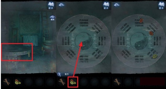 打开地图前往【称骨斋】,点击左侧的桌子,在道具栏选择【骨币】放在桌子上,获得八卦的颜色线索。