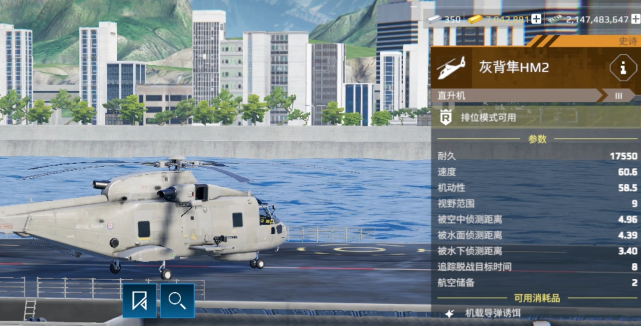 价格较为昂贵的一架反潜直升机,但性能确实很优异。常规情况下灰背隼备载两架,在装备方面除了两组机枪外,还携带两组魟鱼鱼雷以及一组MK11无制导深弹,是一部不折不扣的自卫机,有着很强悍的对空和对水下能力。而且这架直升机在AI的操控下较为智能,出伤速度也足够快。