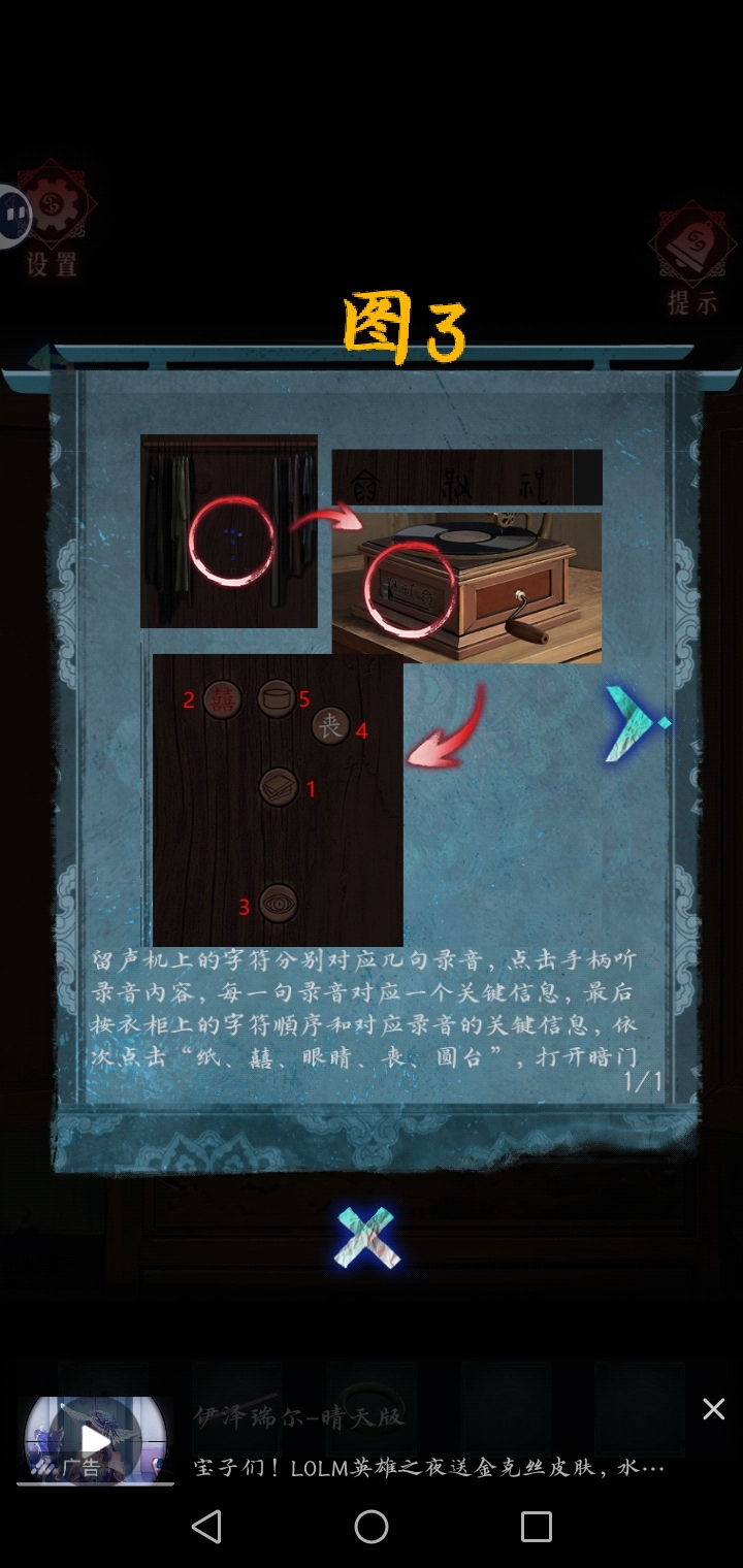 来到中间房子点击播放器播放三段话,获得线索,来到卧室点击衣柜,根据话里的关键信息点击图案,即【纸,囍,眼睛,丧,圆台】如图3,打开暗门