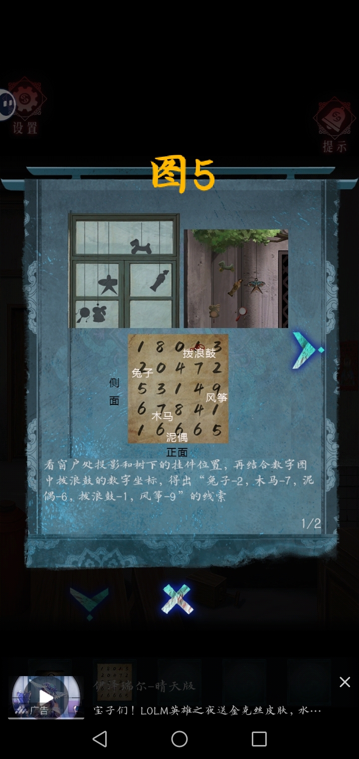 来到中间的房子,点击灯笼观察得到线索,【左上,右上,右下,左上,左下,右下】,即图2,来到卧室打开盒子获得玉镯