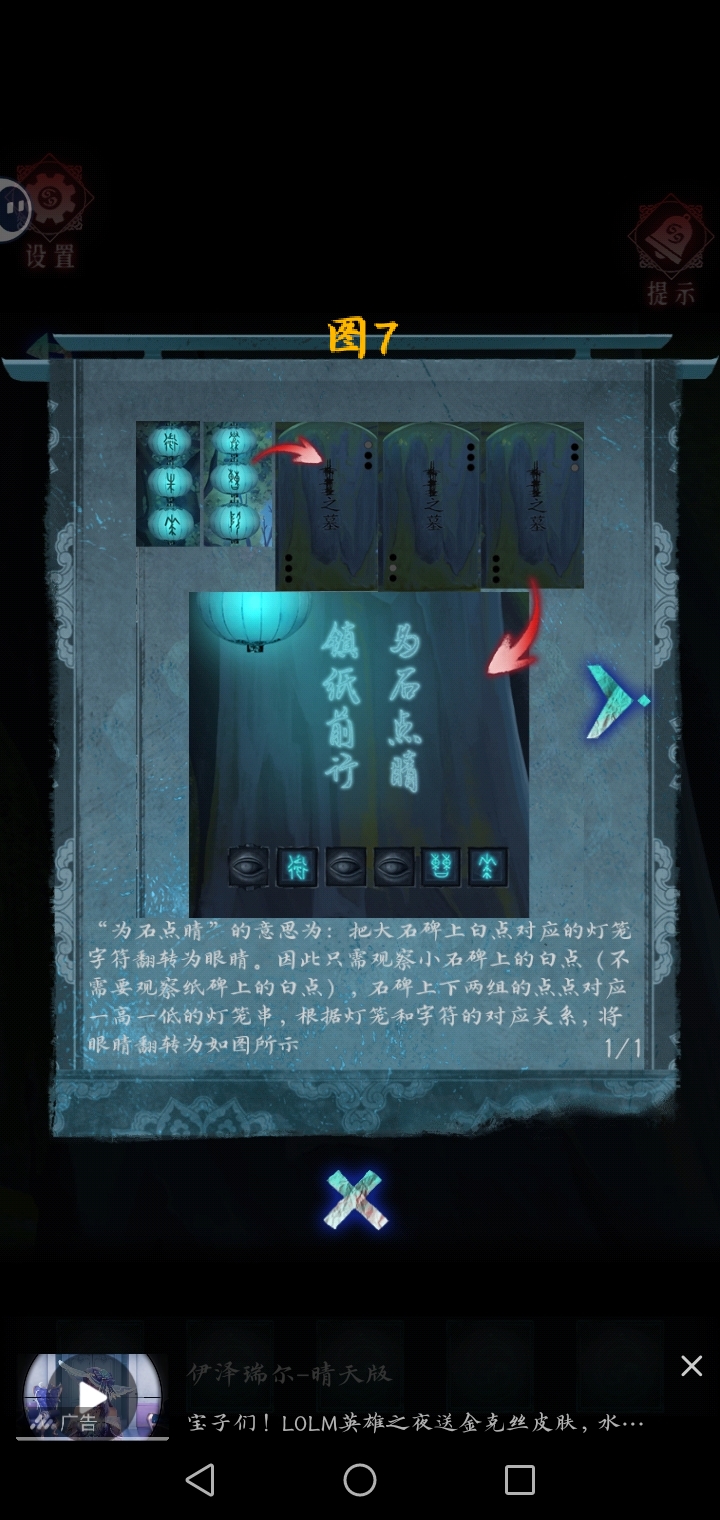 点击左边的灯笼获得白灯笼,点击左边的石头,把灯笼挂在上面,观察墓碑和灯笼,获得线索,翻转眼睛,即【图7】
