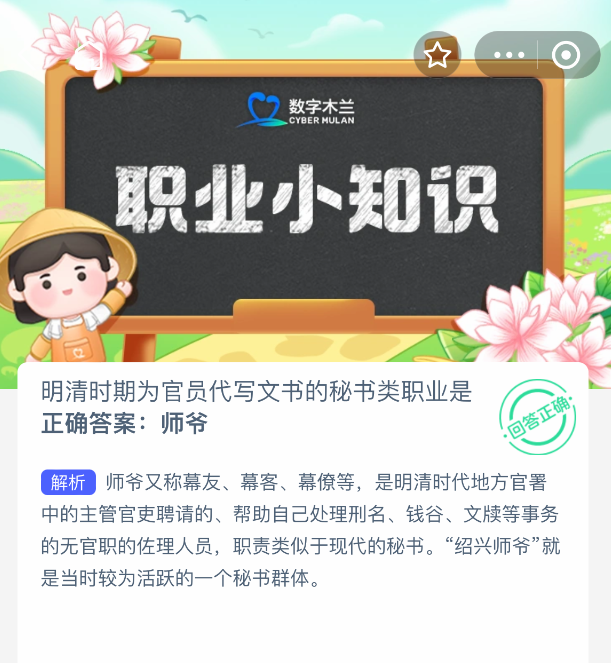 明清时期为官员代写文书的秘书类职业是?这是支付宝蚂蚁新村2025年8月20日题目,每天在蚂蚁新村答题,可以提高木兰币的产速,帮助小镇建设。点击正确答案,会获得“产速+3/时”更多的奖励。今天正确答案是【师爷】。师爷又称幕友、幕客、幕僚等,是明清时代地方官署中的主管官吏聘请的、帮助自己处理刑名、钱谷、文牍等事务的无官职的佐理人员,职责类似于现代的秘书。