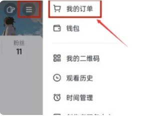 2、进入个人中心界面后,点击右上角的【三】功能,接着选择【我的订单】选项。
