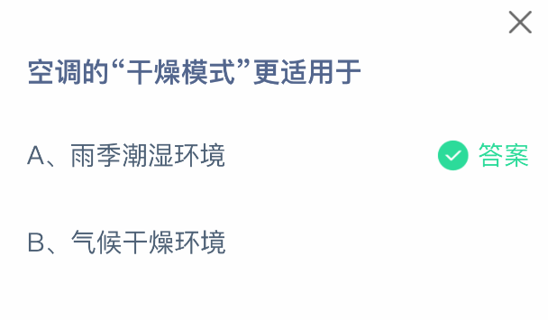 空调的“干燥模式”更适用于?这是8月28日蚂蚁庄园的小鸡课堂题目哦~支付宝里这个小鸡答题超受欢迎的!只要攒够饲料喂小鸡,就能收获更多鸡蛋,一起为公益助力啦!今日正确答案是【雨季潮湿环境】,干燥模式通过降低室内湿度改善闷热感,尤其适合梅雨季、回南天等高湿度环境。