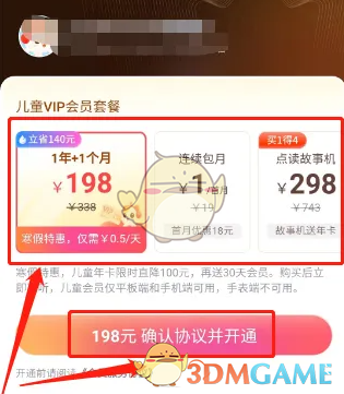 3、进入会员中心,选择儿童VIP会员套餐,点击【198元确认协议并开通】。