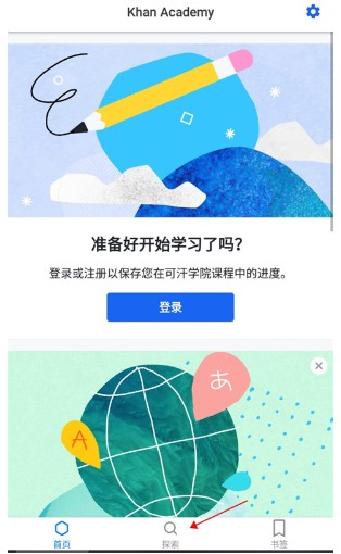 1、打开可汗学院app,用户点击底部的【搜索】,查找自己想要的学习资料