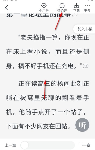 趣读免费小说怎么隐藏评论气泡,如果不喜欢在阅读的时候查看到任何的气泡评论图标,可以点击中间的位置,然后在顶部弹出的工具栏中将【评论开】点击一下,页面上刚刚出现的气泡图标即可马上隐藏起来。