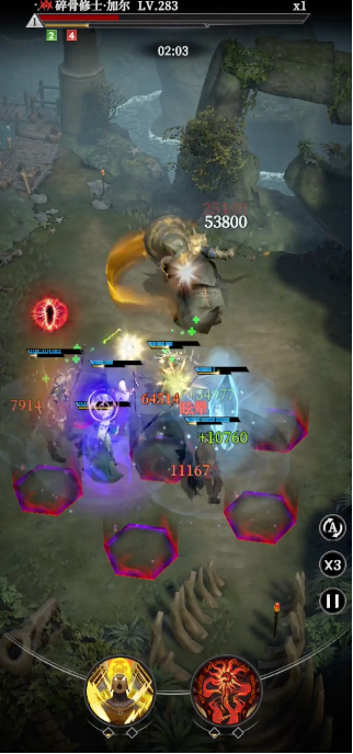 战斗的时候,策略也不能少。把抗伤位的攻击设置成最高,海伦娜的攻击设为第二。开局先别着急用秘宝,集中火力打掉两层坚固,硬扛住BOSS的第一个大招。第二个坚固最好晚点打掉,等打掉后BOSS能量满的时候,让菲欧娜接大招进行控制,然后交替使用灾厄之祭和审判之锤来持续控制BOSS。运气好的话,海伦娜还能穿插进行控制。不过要注意,灾厄不能连续释放可能导致控制丢失。还得调整迅矢释放陷阱攻击,骨语卡位注意不要让墓碑数量减少。