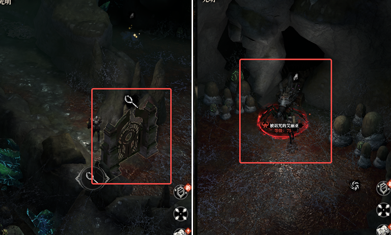 继续前进,会遭遇军团遭遇战,敌方兵力大约是1730。战斗后通往Boss处,击杀Boss后,可以到右侧的传送点。如果携带火把或者魔力达到或高于870,能清除通道中的蛛网。穿过后使用传送点,会见到一个宝箱,里面藏有藏品贤者之石。在地图的另一头,有流浪商人处出售“碎骨钥匙”。购买钥匙后打开左上方的铁门,门后是一个宝箱,里面有恶臭壶1的图纸,并且解锁隐村传送点。