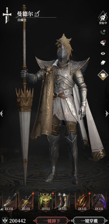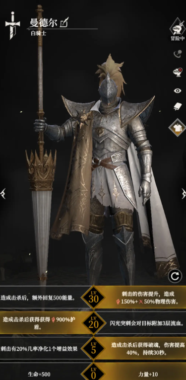 在天赋上推荐大家跟着下图来点,这样能让白骑士在战斗中越打越强,装备上可以根据我们要面对的对手来决定,如果是对群体就选回血套装,如果是面对单体敌人推荐回能套。