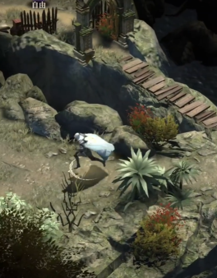 接下来按地图残页的提示去右下角找墓碑,墓碑在一片矮灌木丛旁边,旁边还堆着几个木箱,跟墓碑互动会有两个选项,选搜索能拿到一些基础材料,另外还能看到墓碑上刻着一行小字,这时候就知道要去附近的塔楼解除咒语了,塔楼离墓碑不远,就在西北方向的小高地上,塔顶还挂着个破铃铛,进塔楼后要操作里面的机关解咒,解咒需要角色的魔力值够高,要是魔力不够,就得先回去给角色升级或者换带魔力加成的装备,解咒成功后塔顶的铃铛会响一声,同时远处会有一道淡蓝色的光指向前方,这道光就是通往祭坛的方向,跟着蓝光走大概走个几百米,就能看到祭坛了。