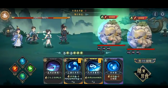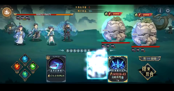这个boss由于会给自己上盾,我们目前血量还扛不住,第一回合我们可以用阵法牌破另一个石精的盾,另外我们需要在中间回合给他破一次盾,方法可以用轮回断水打另一个没有破甲的石精,也可以丢一个剑雷丹破盾,不过我们没有毕方髓血印和战鼓炽晶臂来增加战意了,所以少吃一回合战意丹要亏不少伤害。