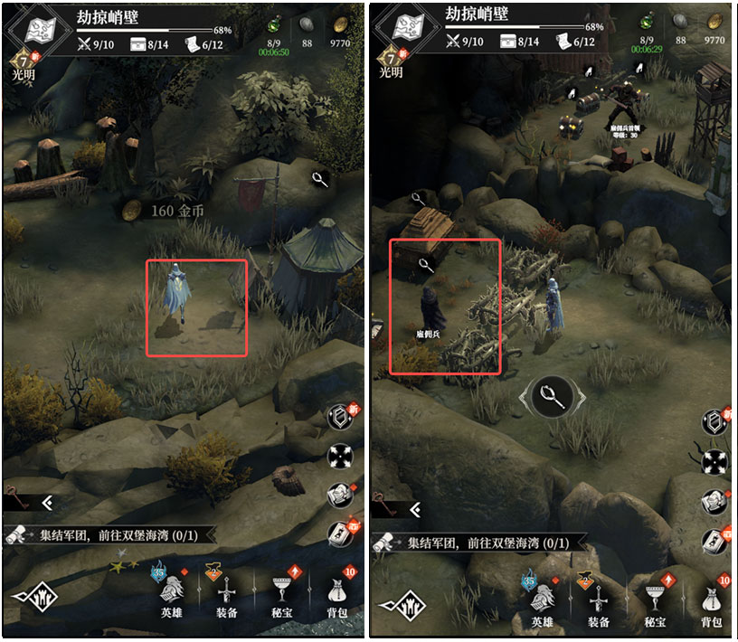 营地奖励拿到后,我们最后前往左下方位置,在这里可以看到巨石利用炸药炸开后就能拿到最后的资源奖励了,拿到后就到事件了。这区域的事件就只有一个,这个事件在佣兵据点大门口的位置,来到这里后需要先使用钥匙包。