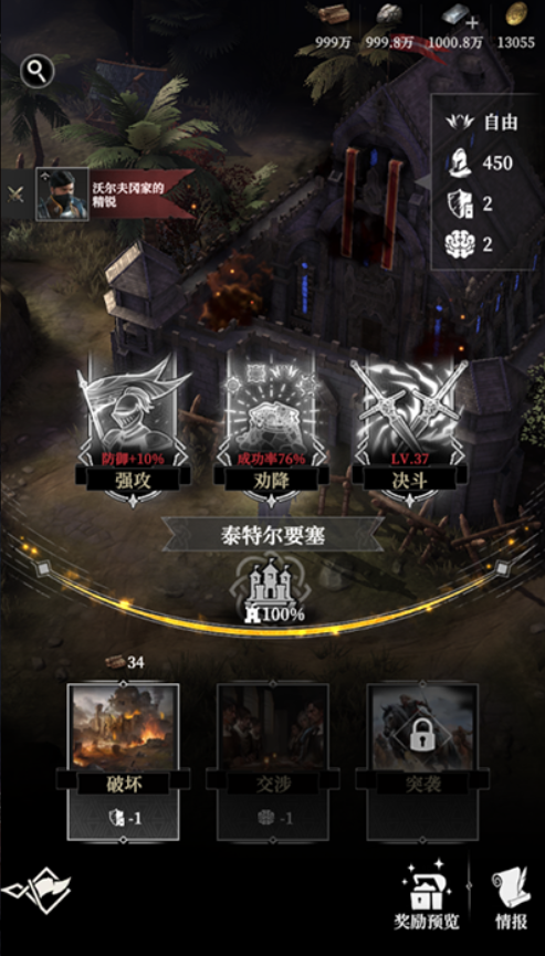 玩家如果在双堡海湾中想要快速的获得资源,先要来到地图上方开启上方攻城战,这时候玩家无法通过决斗来解决的话,就需要消耗对应的金币才能够开启交涉。其实玩家在上方攻城战当中,如果连续三次突袭,一旦串响成功的话,才能够成功的推进下面的剧情,毕竟劝降的时候成功率只有80%,所以说玩家还有20%的情况将会面临失败,另外在下方攻城战当中,这时候需要玩家完成上方攻城战才能够顺利的解锁,此时玩家需要进行三次破坏,还将会面临一次突袭。另外在这里所涉及到的劝降成功率只有76%。