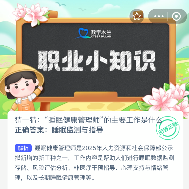 猜一猜:“睡眠健康管理师”的主要工作是什么?【蚂蚁新村每日一题】2025年9月25日题目已发布!坚持答题,积累木兰币,即可加速小镇建设。答对本题,立即可享“产速+3/时”的加速奖励!今天正确答案是【睡眠监测与指导】。睡眠健康管理师工作内容是帮助人们进行睡眠数据监测存储、风险评估分析、非医疗干预指导、心理支持与情绪管理,以及长期睡眠健康管理等。