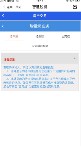 2、点击“房产交易”、“增量房业务”,弹出的房产交易界面共有“待申报”、“待缴款”、“已完成”三个栏次;