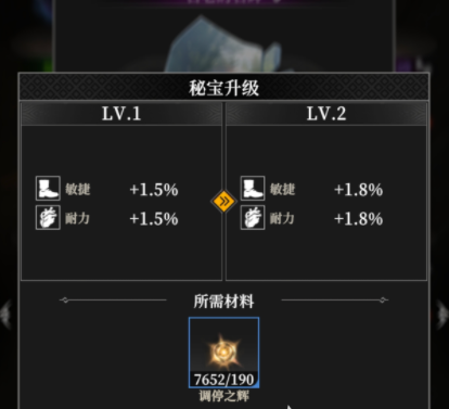在对秘宝进行升级前,需要先来了解下秘宝的功能。秘宝的功能类似于装备,装备后直接提升角色的属性。秘宝根据功能可以分为两类,神力类和属性类。其中神力类主要增加角色在战斗过程中即时性的输出能力和血量值的提高,属性类则是角色属性长期的提升。所以玩家可以着重于属性类的秘宝升级,当战力不够时可以考虑提升几个神力类的秘宝来帮助玩家有更好的战斗效果,帮助玩家能通过资源本获得更高阶的道具。