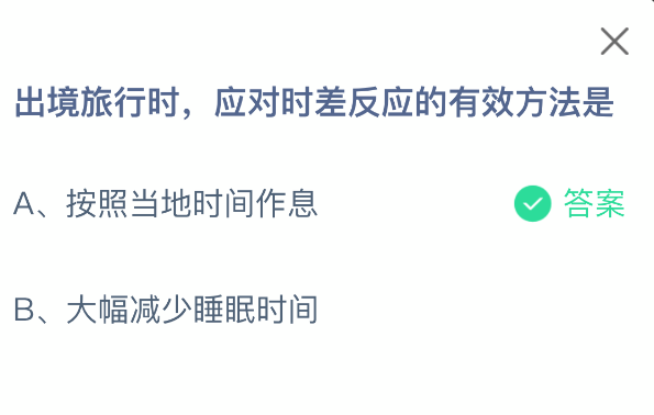 以上就是出境旅行时,应对时差反应的有效方法是,支付宝蚂蚁庄园2025年9月27日答案最新,更多精彩内容,请点击关注0405手游网更新!