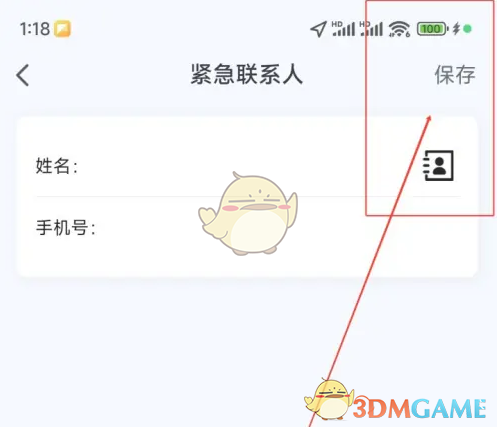 4、在跳转的新界面中输入姓名和手机号等信息后,点击右上角的“保存”,即可完成添加紧急联系人的操作。