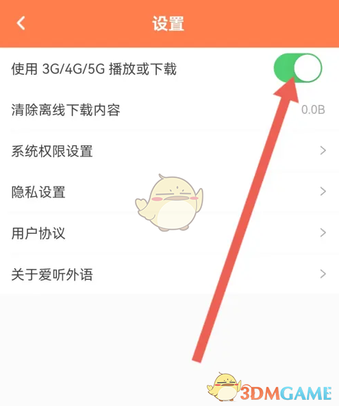 若想在爱听外语APP中开启流量下载与播放功能,可打开APP后点击界面右下角的【我的】按钮,进入个人页面后选择【设置】选项,在设置菜单中找到并开启【使用3G/4G/5G播放或下载】的按钮,即可通过移动网络进行音频的播放与下载。