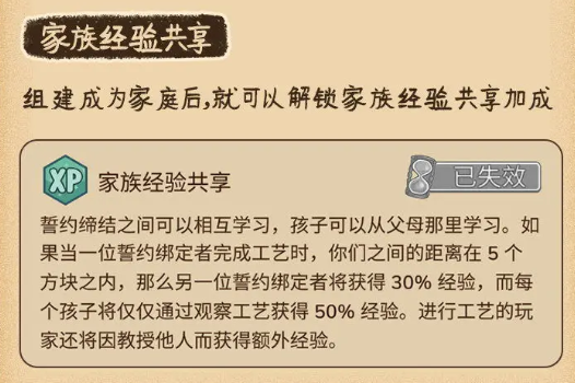 誓约缔结之间可以相互学习,孩子可以从父母那里学习。如果当一位誓约绑定者完成工艺时,你们之间的距离在5个方块之内,那么另一位誓约绑定者将获得30%经验,而每个孩子将仅仅通过观察工艺获得50%经验。进行工艺的玩家还将因教授他人而获得额外经验。