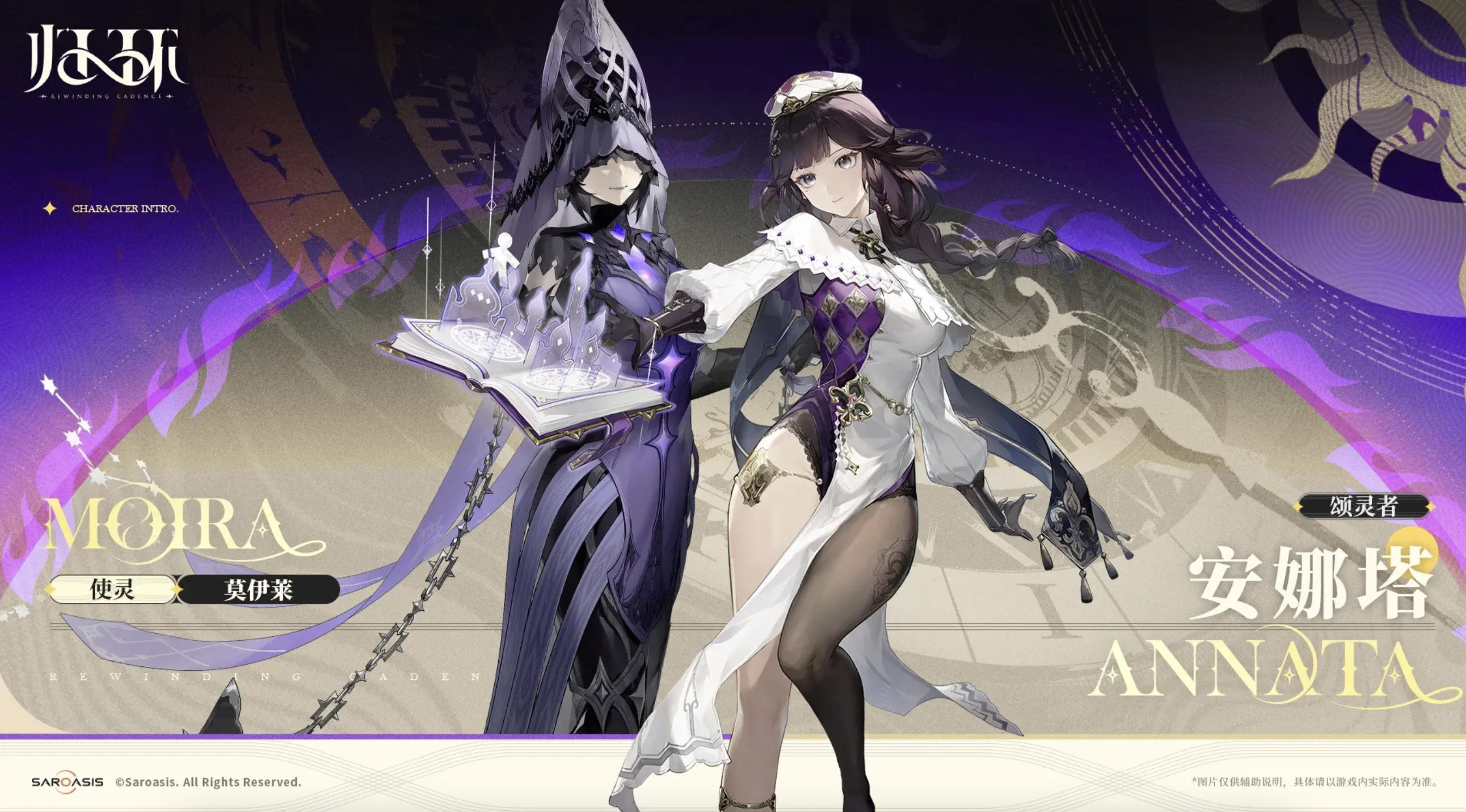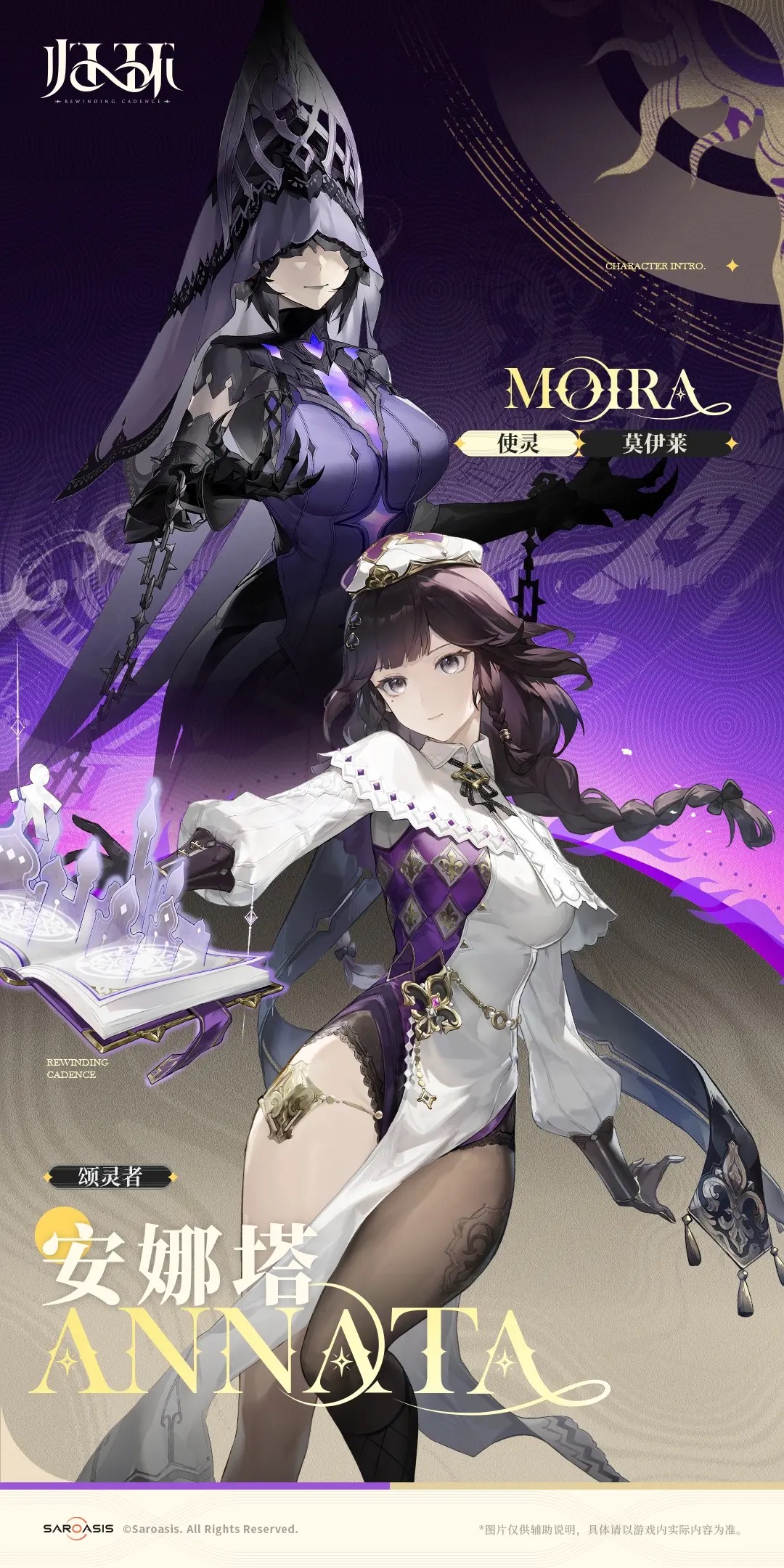 从立绘来看,安娜塔身着学会风格的制服,白色与紫色交织的配色优雅而端庄。她的长发微卷成辫,额间点缀饰品,既保留了少女的柔美,又体现出学者的沉稳。她身边漂浮的魔法书散发光辉,纸页上浮现出幻影般的符文与人偶剪影,仿佛随时可以化作术式投入战斗。整体造型既有学者的优雅,又带着战斗的锐气。