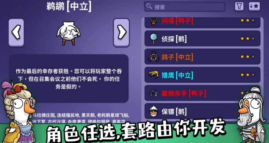 玩家所需要了解的就是轮换模式涉及到八大模式,其中经典模式是整个游戏的基础。也是玩家的起点,玩家进入到鹅鸭杀手游的时候会随机分配身份,而在鹅鸭杀手游中涉及到三大阵营。而每一个阵营所代表的目标都是不一样的,所以玩家在体验经典模式的时候,主要是了解鹅鸭杀手游的规则。