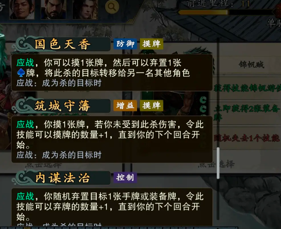 要想更加稳妥一些,也可以多加几个技能去补补漏洞,例如乱世奸雄,还有乘马射虎,或者是倾国倾城。这几个技能其实都是比较有优势的,如果想要玩的更猥琐一些,那就可以直接偷了防御三件套。有了这防御三件套之后,那坦度这一方面就无需担心,就算对面打你半天都不会掉血,你还可以和他们慢慢去磨。对于苟活流来说,这就是一个福音,想被打死都难。不过在偷技能时也有一些技巧,例如先发制人就需要刷到队友才能够拿到,或者是刷到对手,手里面有左慈。