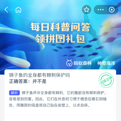 狮子鱼的全身都有棘刺保护吗?【神奇海洋】10月7日新题目已开答!正确答案现已公布,点击领取拼图,一起为修复海洋生态贡献力量!今日正确答案是:【并不是】,狮子鱼并非全身都有棘刺,它的腹部没有棘刺保护,容易受到伤害。