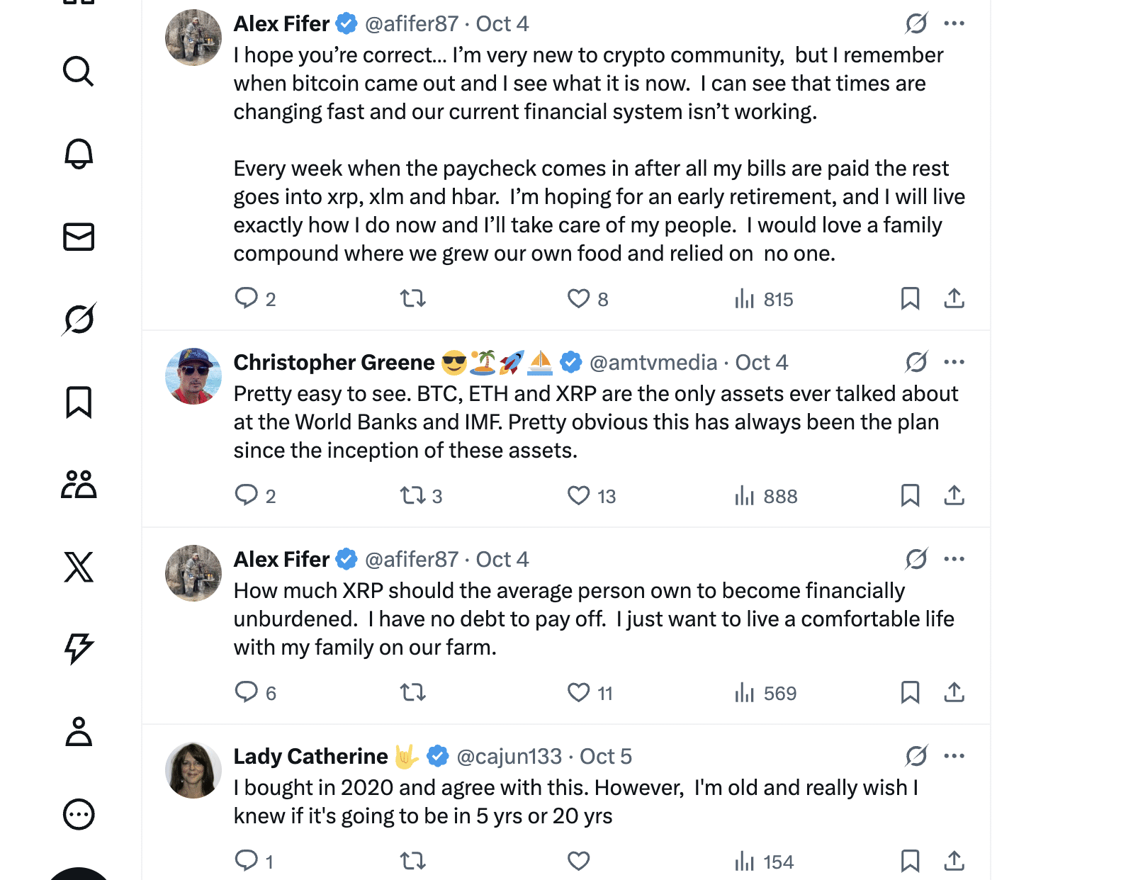 其中Alex Fifer表示正在稳步积累XRP、XLM和HBAR,计划提前退休并与家人过上自给自足的生活。