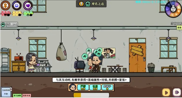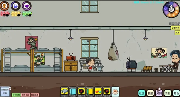 游戏场景中有各种各样的物品可以交互,用于提升属性。每提升一次属性,都会减少相应的体力,心力,脑力值。同时,右上角的时间会流逝一小格。一天有8次训练属性的机会,深夜不能训练属性,只能睡觉。
