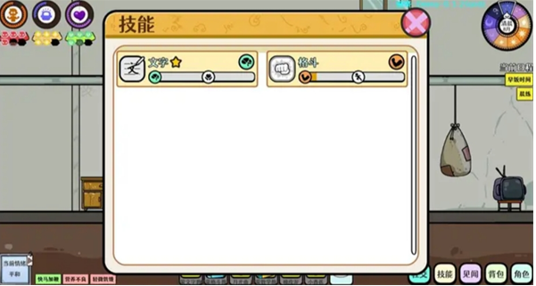 目前开放的技能有:文字,数学,格斗等等。你的基础属性值(就是技能右上角显示的属性值,以上图为例,文字为理解,格斗为力量)和协调属性值(以文字为例,协调属性值为共情)越高,你的技能学习速度就越快。所以各位在学习技能之前,需尽可能拉高基础属性和协调属性。