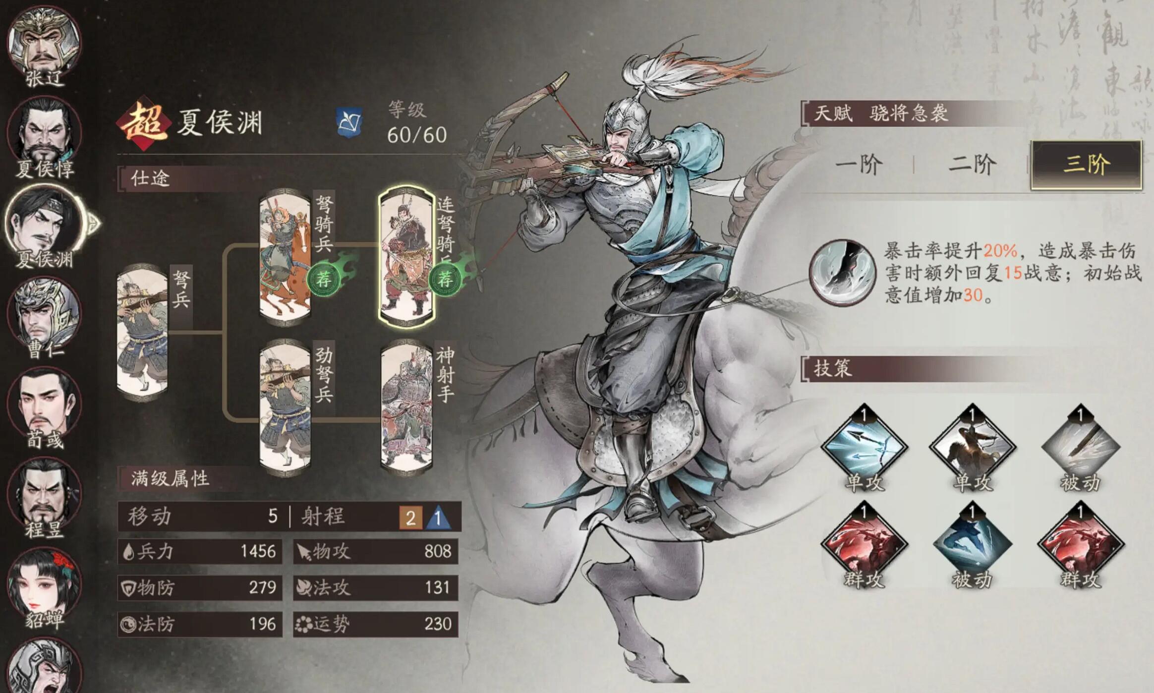 第二梯队可以缓一缓再升,夏侯渊2阶暴击率+15%,弓兵爆发核心,不过三阶暴击回战意实用性真的低。夏侯惇2阶残血能回复32%兵力,没奶妈的时候是刚需,三阶那点提升真没必要急着升。张郃要憋到3阶才发力,全武将克制增伤15%,搭配副将藏霸能叠到20%,后面这个组合打困难图特别好用。