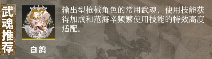 白鸽:是一个比较适合输出型角色使用的武魂,但是更搭配的是枪械类型的角色,如果是跟范海辛一起大诶的话,还可以带来频繁使用技能的次数提升效果,在武魂的特效上面是高度适配范海辛这个角色的,所以经常两者绑定上场,带来的效果是普攻或者是魂技命中敌人后,后续的2秒内再次使普攻或者魂技,在伤害数值上面会增加10%,这样的效果最多的话是可以叠加10次的,也可以搭配奥利维娅之类的角色用。