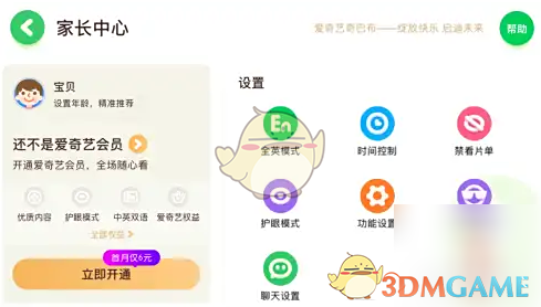 打开爱奇艺奇巴布APP,进入菜单页面后点击“家长中心”,通过成语验证家长身份(如点击系统给出的五个字中的四个组成成语),进入“小奇星设置”后点击开关按钮,当按钮圆点颜色变为绿色时,即表示小奇星功能已成功关闭。