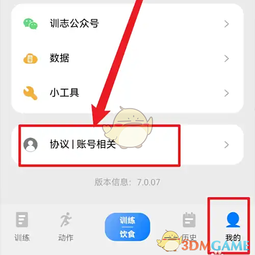 1、打开训记app,进入【我的】界面,点击【协议/账号相关】。