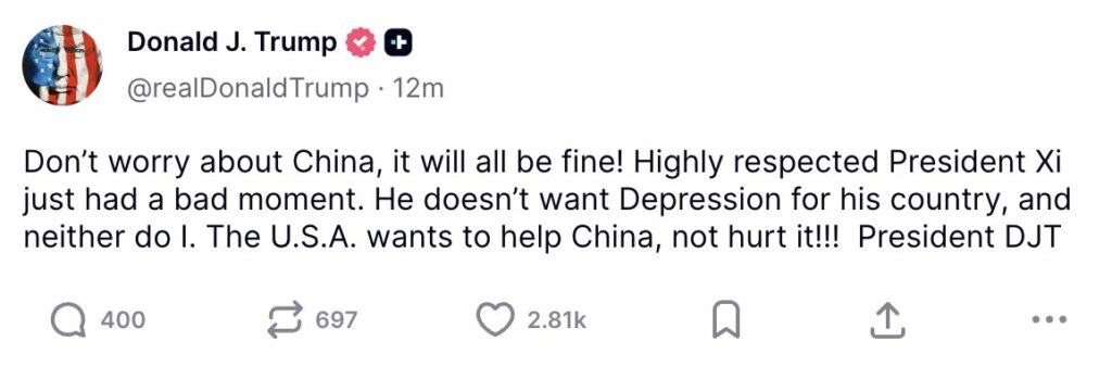 特朗普总统:别担心中国 来源:Truth Social