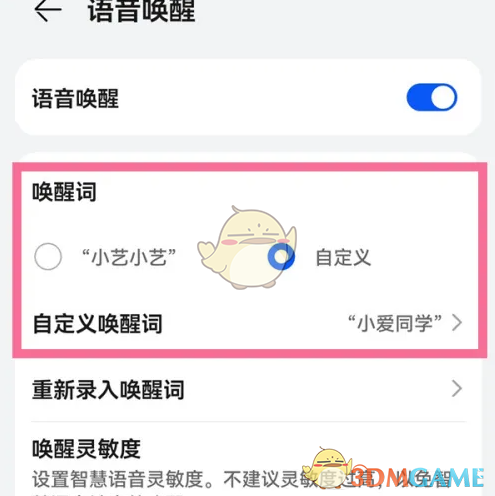 3、打开语音唤醒,点击自定义,输入唤醒词。