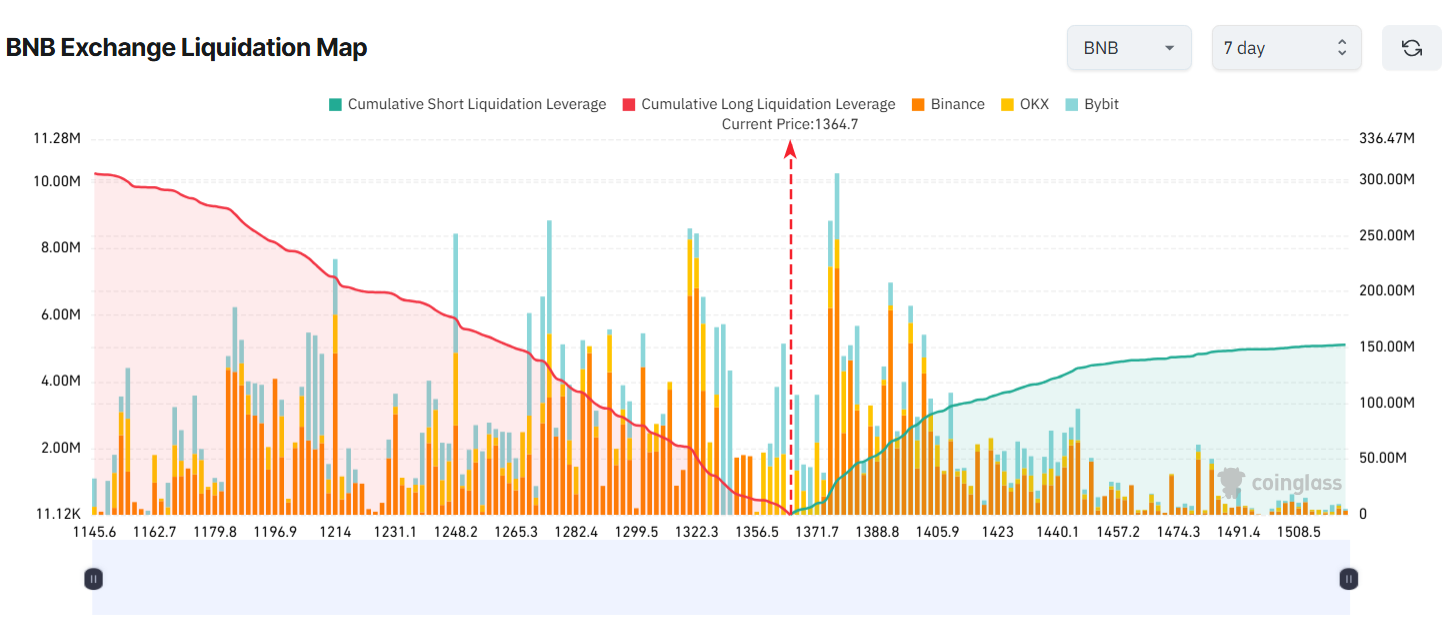 若BNB本周回调至1,150美元,多头交易者可能面临超3亿美元清算。反之若突破1,500美元创下新高,约1.5亿美元空头仓位将被平仓。