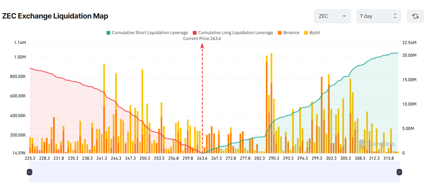 若ZEC延续涨势突破315美元,超2,000万美元空头仓位可能清算。反之若跌向227美元,约1,700万美元多头仓位面临风险。