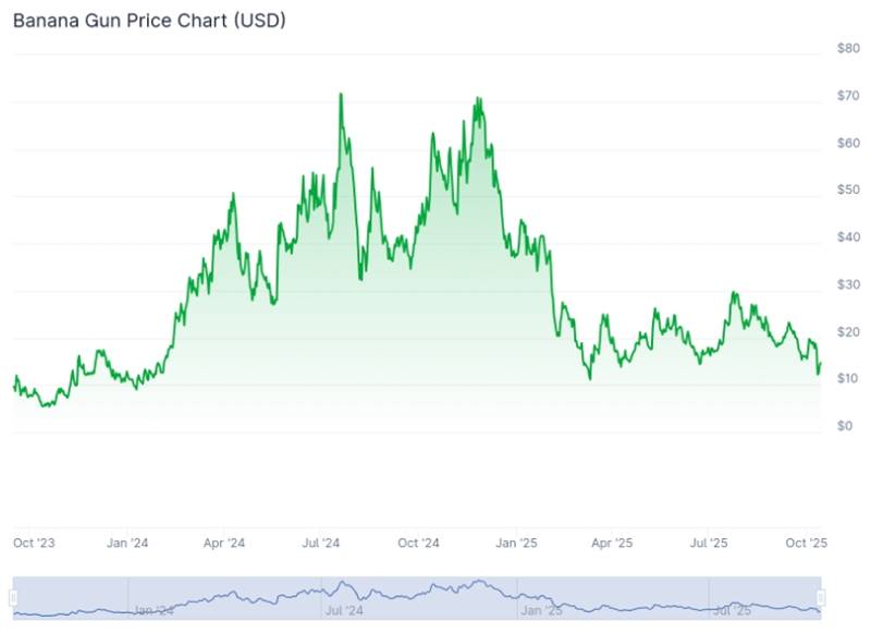 At its peak, Banana Gun saw weekly trading volumes exceeding $293 million and a token price of $78.70 before settling at a $56 million market cap—still delivering 46x returns from its launch.