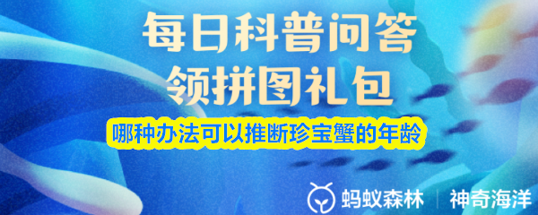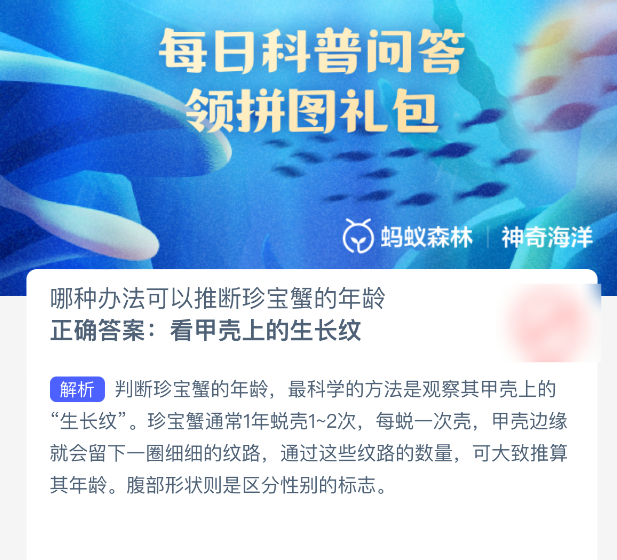 哪种办法可以推断珍宝蟹的年龄?【神奇海洋】10月14日新题目已开答!正确答案现已公布,点击领取拼图,一起为修复海洋生态贡献力量!今日正确答案是:【看甲壳上的生长纹】,判断珍宝蟹的年龄,最科学的方法是观察其甲壳上的“生长纹”。珍宝蟹通常1年蜕壳1~2次,每蜕一次壳,甲壳边缘就会留下一圈细细的纹路,通过这些纹路的数量,可大致推算其年龄。