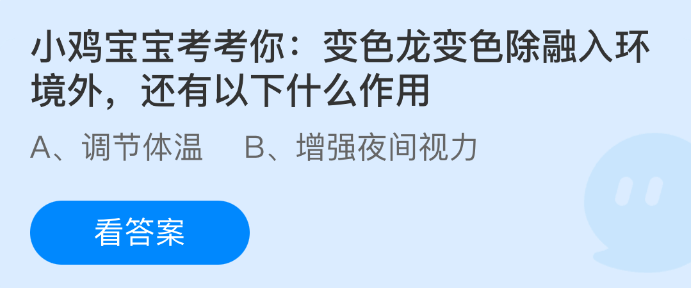 以上就是小鸡宝宝考考你:变色龙变色除融入环境外,还有以下什么作用,支付宝蚂蚁庄园2025年10月15日答案最新,更多精彩内容,请点击关注0405手游网更新!