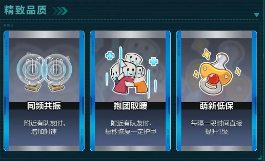 可以先从超玄体阵营的卡牌说起,如果是精致品质,里面就有一些很适合组队的卡。同频共振很实用,只要附近有队友,那就可以有效提升射击的速度,在抱团冲点的时候火力就可以直接的拉满。还有抱团取暖,同样是队友在身边,基本上每秒都可以回护甲,再也并不需要打着打着连护甲都没有了,直接变成脆皮。对新手来说,靠这两张卡直接就可以拿低保。在精致品质里面还有一个萌新低保,每相隔一段时间就可以直接升一级,前期的发育速度就可以直接起飞。
