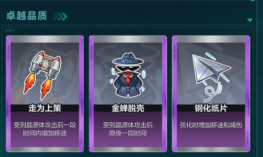 接着也可以看一下卓越品质的超炫皮卡,那也是实用挂。走为上策就比较适合在打不过要撤的时候,只要是被晶源体攻击到那接下来一段时间就可以让移动速度变得更快一些。还有比较出色的金蝉脱壳,一旦被打了之后就会进入到隐身的状态,不管是躲起来等待队友支援,又或者是直接绕到后面去偷人都是比较好用的。还有钢化纸片,这就是在悬化时候要给加成减伤,还有移动速度全部都可以一起上涨。